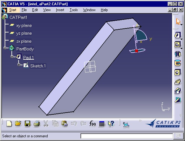 The modified pad is saved in the CATPart document stored in the file whose path is the second argument passed when launching CAAPriCreateModify. The figure shows modified pad for which the height is now two times the initial height, and the extrusion direction is no more perpendicular to the sketch plane. The session is then deleted. This is the usual sequence for saving a document and closing the session [3].