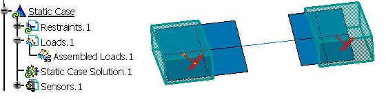 This use case shows you how to create an assembled load. Here use of Edit/Search... capability through VB is also demonstrated. This macro opens an analysis assembly document and creates an assembled load. With the use of edit search all the objects with name "load" are selected and they are applied to the load set. An assembled load is an entity defined in an assembled analysis and therefore applied on the assembled mesh. This load is the concatenation of several loads defined in the sub analyses. This scenario is available only with the Generative Assembly Structural Analysis (GAS) product.
