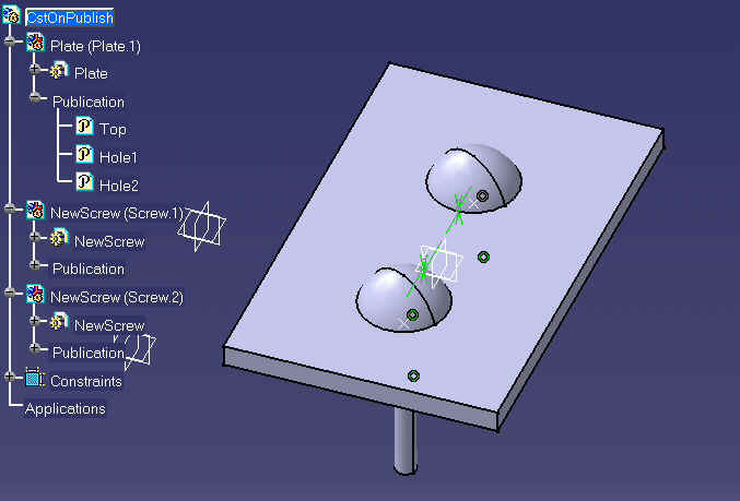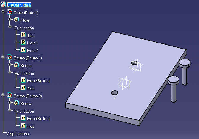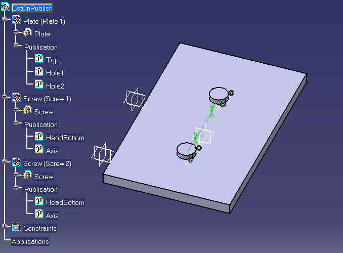 CAAAsmCstOnPublish includes the following steps: PrologThe macro first loads CAAAsmCstOnPublish.CATProduct that contains two Part: Plate.CATPart and Screw.CATPart for which two instances have been created: Screw.1 and Screw.2. Those objects use the Publication capability of CATIA V5 to expose some of their elements using a stable name. The plate published as "Top" its top face and as "Hole1" and "Hole2" the center points of the two holes. The screw publishes as "HeadBottom" the bottom face of its head and as "Axis" its axis.