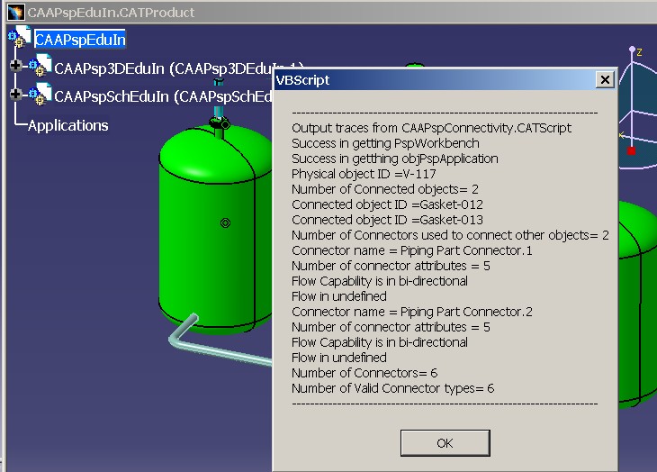 This use case is intended to show how to obtain a part's connectors and get connectivity and connector flow data using a macro. This macro opens the document CAAPspEduIn.CATProduct. From the root object of this document, the macro obtains a 3-D physical objects and then gets connected objects to it, and then gets connector and flow information for each connected connector. |