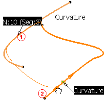| Two tags for each reference element are displayed near the matching curve extremities. Only one reference element is current, meaning that you can only manipulate the second extremity of the matching curve, while the other extremity is fixed. To be able to select another reference element to perform another match, you must click the corresponding tag. | |||
