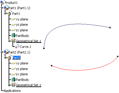In the specification tree, the matched curve is created in the current part as well as the copied curve which is put in no show. |