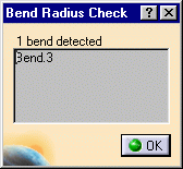 If you display the Sheet Metal Parameters dialog box and that a bend differ from the set value, clicking OK will automatically highlight the bend involved and display the Bend Radius Check dialog box. | |
