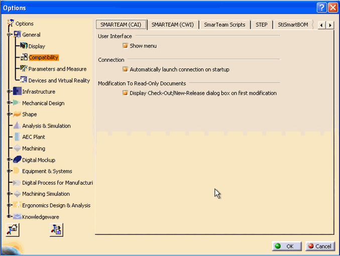 The SmarTeam (CAI) tab contains the following options: User Interface > Show menu