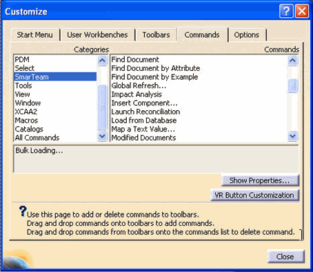 For details about the remaining fields in this window, see Other SmarTeam Options for CATIA Integrations. SmarTeam CategoryIn CATIA, a new category named SmarTeam has been added to facilitate easy selection of SmarTeam commands.To access the SmarTeam category: